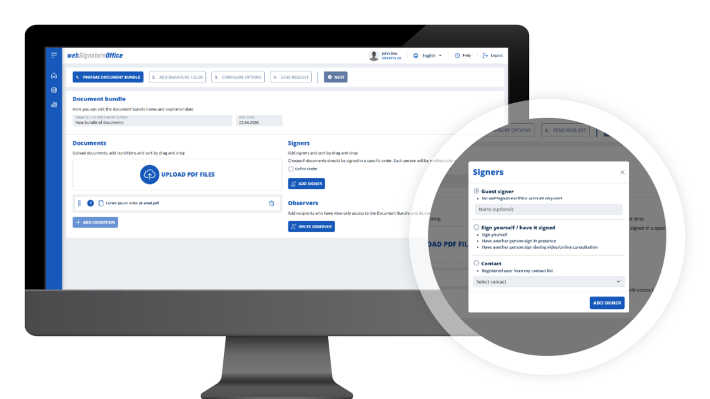 Mit der Online Signatur Lösung webSignatureOffice können Sie nicht nur selbst Dokumente unterschreiben, Sie können auch Unterschriften von Anderen anfordern. Die „Signaturanforderung“ kann per E-Mail, oder auch z.B. in einer Video Beratung, per Scannen eines QR-Codes erfolgen. Die Unterzeichner können das Dokument anschließend ansehen und unterschreiben.