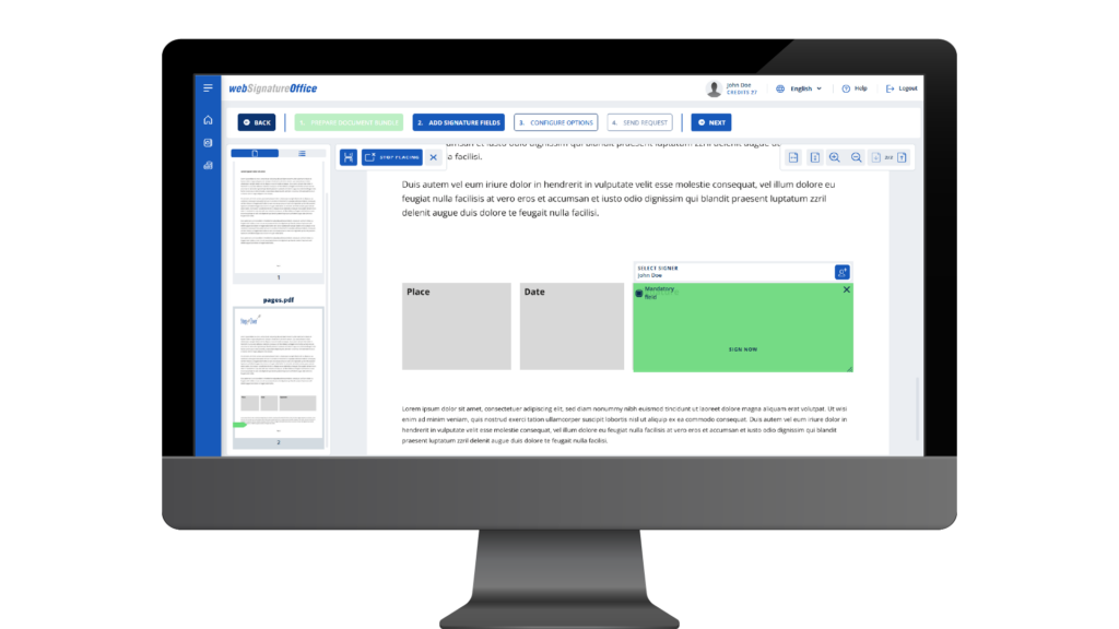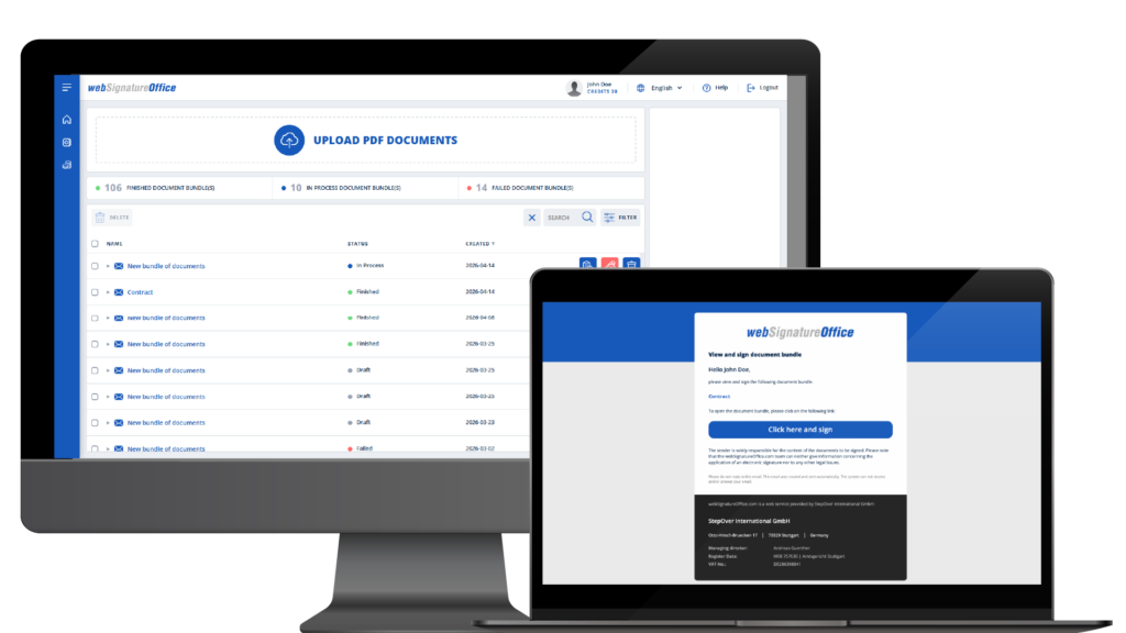 Bei webSignatureOffice bezahlen Sie mit Credits. Nach der Registrierung erhalten Sie kostenlos 3 Credits. Bei fortgeschrittenen Signaturen entspricht dies beispielsweise 3 Dokumenten mit unbegrenzter Anzahl an Unterschriften. Empfänger können grundsätzlich kostenlos online signieren. Bei webSignatureOffice haben Ihre Credits kein Verfallsdatum. Einmal gekauft, bleiben Ihnen nicht ausgegebene Credits so lange erhalten, wie Ihr Benutzerkonto besteht.